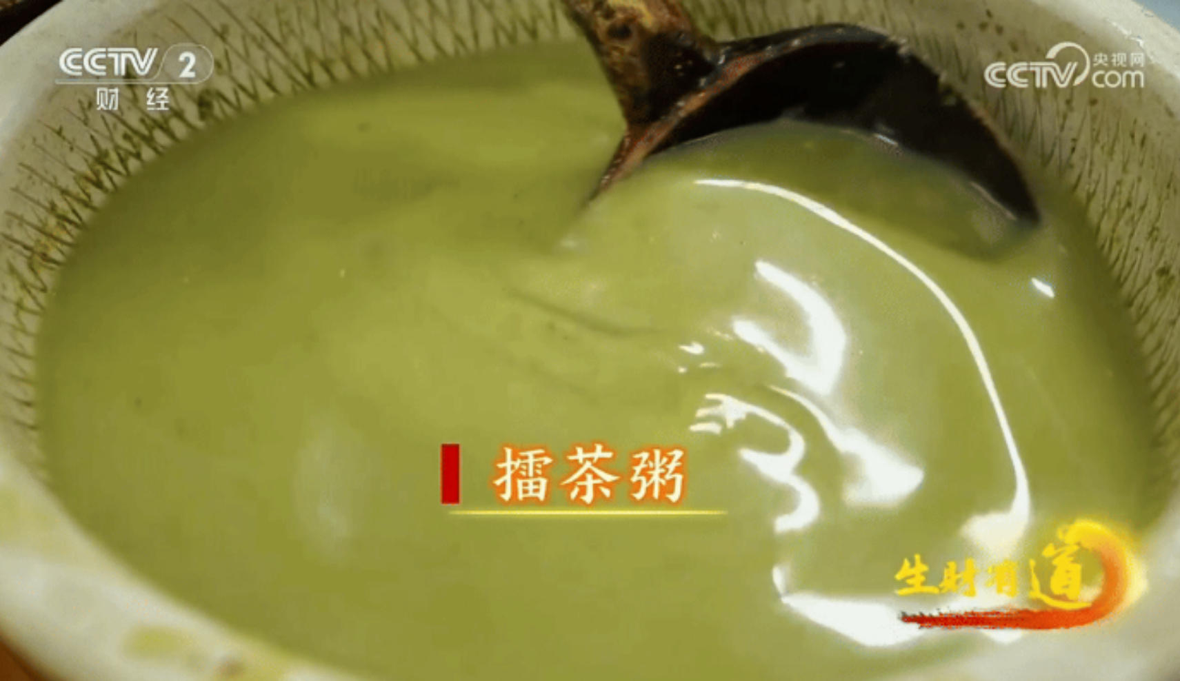 将鲜茶叶、油、水、盐、花生擂烂,加入沸腾的白粥调制而成,微苦而甘,可生津止渴,清热解暑。当地人食擂茶粥必配小吃,边喝边吃,堪称“碗碗生津,匙匙养神”。